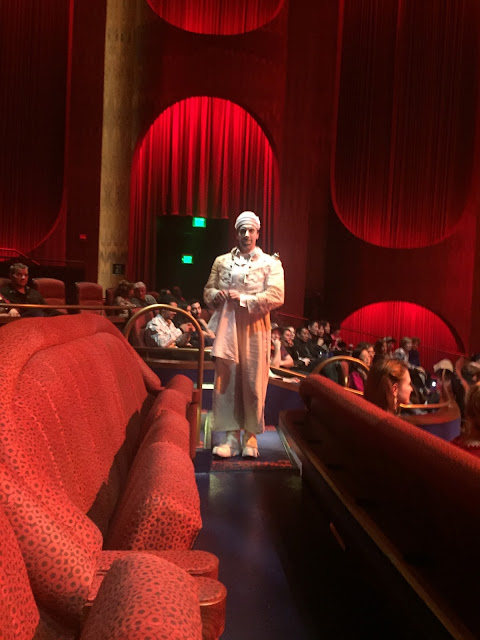 Zarkana is a spirited journey through an abandoned theater where an extraordinary circus comes back to life. Populated by a motley collection of off-the-wall characters and acrobats, Zarkana is a visual vortex set in a twisted acrobatic fantasy, where, little by little, chaos and craziness give way to celebration.While people are taking their seats, we had characters going through the audience.