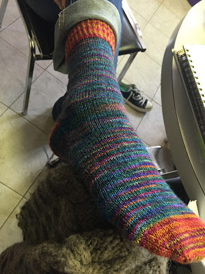 There was enough yarn left over from the shawl that Lynn is making a pair of socks. The first sock is blue with an orange cuff, heel and toes and the other sock is opposite. We didn't think there was enough to do two blue socks. Reversing the colours makes a cool pair of socks and helps with second sock syndrome. It feels like you are starting a new pair. :)