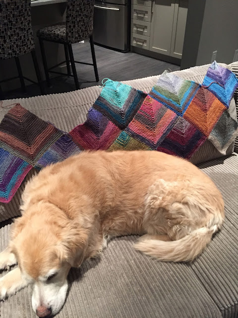 Melo decided that he needed in on the action. Yes, you might say that I'm a bit obsessed. It's easy knitting. You are starting with 67 stitches and decreasing every wrong side row. After one diamond you have the pattern memorized. Now it's time to get back to it. I might be able to finish another diamond tonight.
