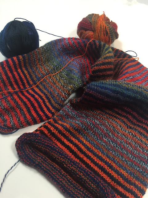 Beth is working away on her Crazy Zauberball scarf. She's already planning her next one. There was a request for me to bring home different colours for her to choose from.