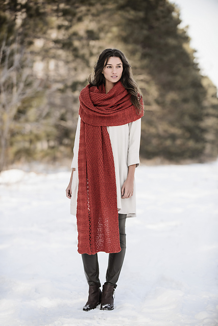 Pattern: Endless Wrap (purchase on Ravelry) Wrap yourself in yards of cozy Woolstok. Fun to knit, fun to wear, the Endless Wrap is a long swath of lofty, textural knitted fabric. Panels of knit/purl and yarn over patterns make this a good next step project for a beginner knitter.