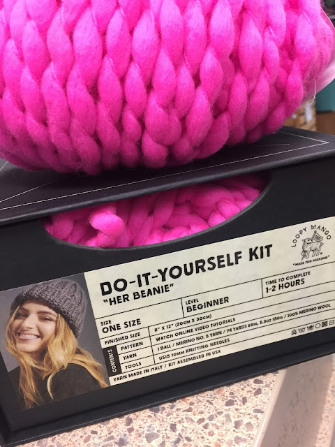 We received a shipment today from Loopy Mango. We needed 35mm needles and to top up our Big Loop. In the box was a hat kit for the Food Drive Prize Basket. The kit includes one ball of yarn, the pattern and the needles all packed in a cute box. I was given a sample ball at TNNA that is the same colour and same lot. I'm adding it too - now a pompom can be added to the hat.