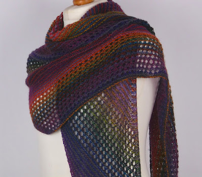 Brackenreid is a slightly asymmetrical shawl/scarf, worked sideways on the bias, using garter stitch and an eyelet pattern.