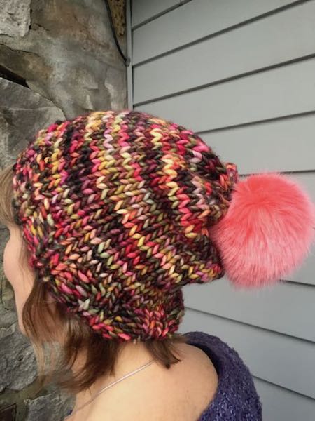 We received a shipment of pompoms this week and more will be coming next week. We knit The Big Hat (pattern free on Ravelry) with one skein of tosh ASAP and added a large pompom. We also have smaller pompoms.