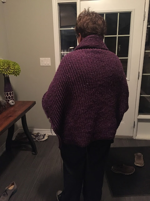 I thought I was finished the back last night when I posted but I really wasn't. I needed to do some decrease rows first. The back is now finished, I've cast off 49 stitches and I'm working down the front.