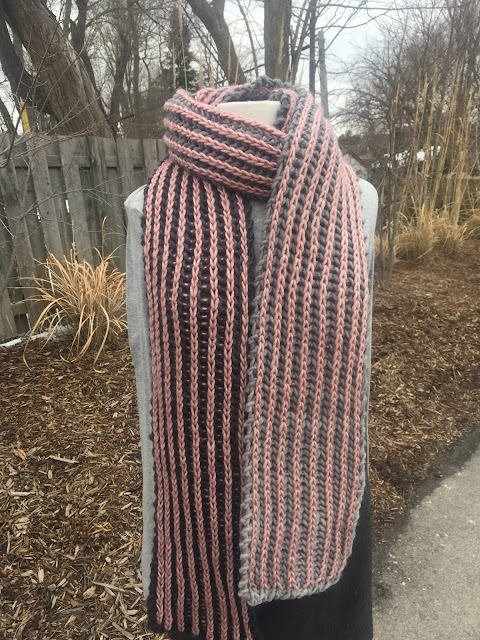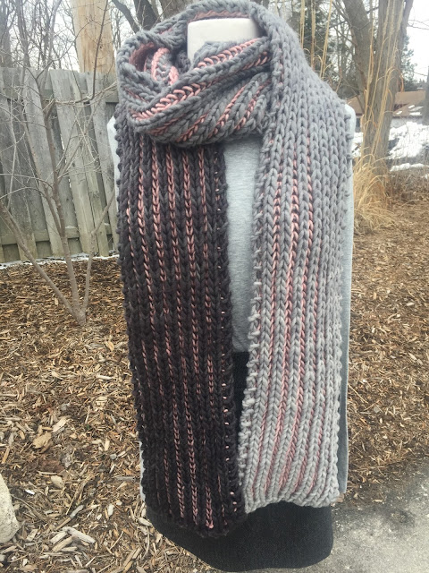• This design only works with a cast on of 60 stitches. • The 80g ball is for socks in sizes 36 to 41. • This sock is worked from the cuff down, working as a tube, then one will add the heel in at the end. • The heel and toe are worked in the same way, making things a little easier. • To help the knitter further, the beginning of the yarn is marked with EASY START on the ball band. • And to help getting the correct tension, a small stripe section in stocking stitch is added. It is important that the stripe should be exactly 1 round of knitting, if it is longer than 1 round, the knitter should go up a needle size. If it is shorter than 1 round, you should go down a needle size. • Once in the main section, the knitter will see the leopard print spots appear as she works. If the leopard print design is leaning to the left, she is knitting too tightly, if they are leaning to the right she is knitting too loosely.Alex finished her scarf - the Beginners Brioche Scarf (pattern purchased on Ravelry)