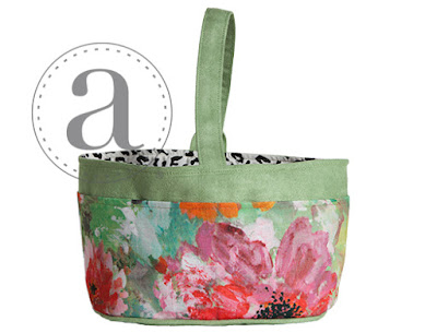The Atenti Tea Rose Hope Basket- A roomy stand-alone project bag. Top rolls down for easy access. Wide opening and two handles. Fully lined in water our light tan water repellent taffeta. Inside are three pockets. 12" tall x 8" wide x 8" deep