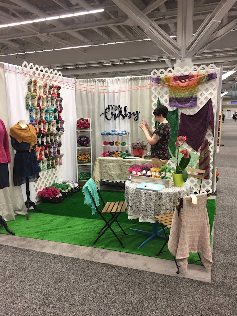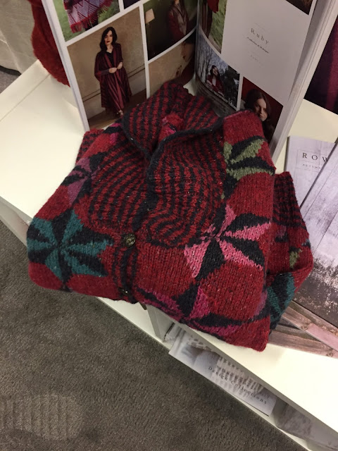 We carry Dyed in the Wool from Spincycle Yarns. At the show they introduced a new worsted weight version called Dream State. I wasn't going to order the yarn until I saw this cardigan in their booth called Tensho Pullover (purchased on Ravelry). It is a sweater the Spincyclesteaked steeked (I haven't had breakfast - I might be hungry). One skein of Dream State is all it takes for the colourwork.