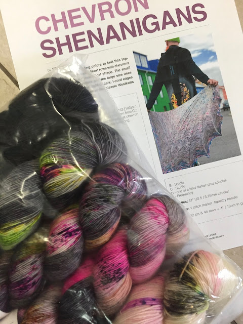 I had a bit of an epiphany today. Why not use a Fading Point kit to knit Chevron Shenanigans (pattern purchased on Ravelry)? The large size takes 5 skeins of fingering weight.