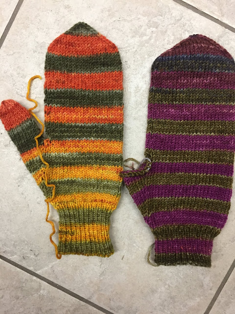 Alex has been busy knitting. Two mittens finished (almost) out of one ball of Uneek Sock. She is going to make mittens that match out of the other ball.