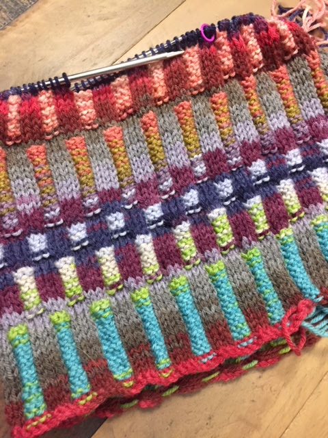 Beth had fun at Camp dying sock blanks. She should have taken a picture before winding it into a ball. Now she's knitting it double strand into a hat. She is very proud of herself.