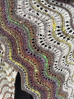Relax and take it easy while you knit this colorful cotton blend shawl with a repetitive, classic, lace stitch pattern. Asymmetrical shawl starts with just a few stitches, adding in additional pattern repeats as it grows. The soft, muted tones of Noro Kumo contrast with the bolder colors of Noro Mirai creating a color landscape of rolling hills and valleys.I was very quick taking pictures. It was cold and the snow was blowing.