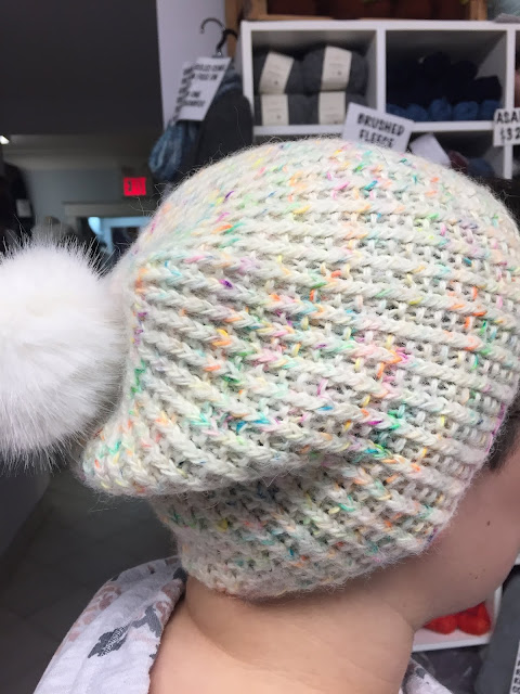 Alex has a new hat. She used one strand of HH Sock with one strand of Rowan Alpaca Classic. The Alpaca Classic makes the hat very soft. Then she finished it off with a pompom.