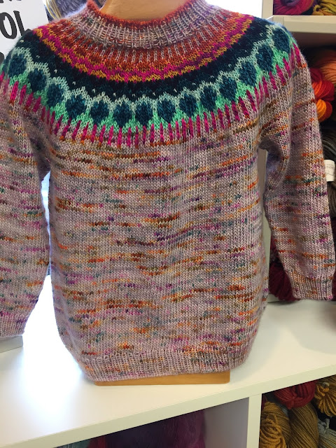 Alex also knit this adorable little sweater. Christmas in July (pattern purchased on Ravelry). The body is Hedgehog Skinny Singles. The contrast colours are leftovers from the many shawls that Alex has knit.