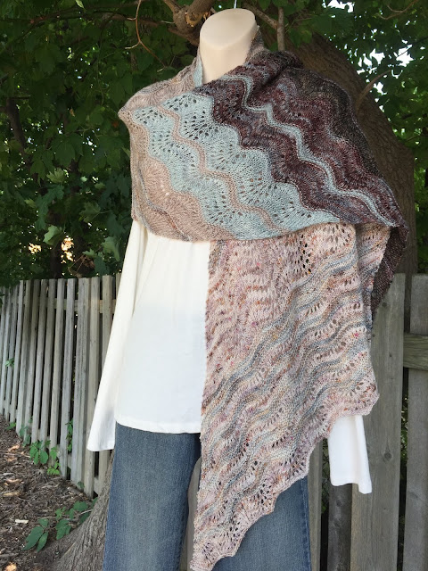 Time Trades Wrap, an elegant shawl combining simple lace stitches with gorgeous hand-dyed gradient colors.