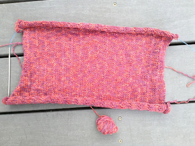 The front is growing. I hope to get the pattern stitch done and onto the stocking stitch tonight. The neck shaping starts there. Shorter rows. Then the armhole and the rows really start to get shorter.