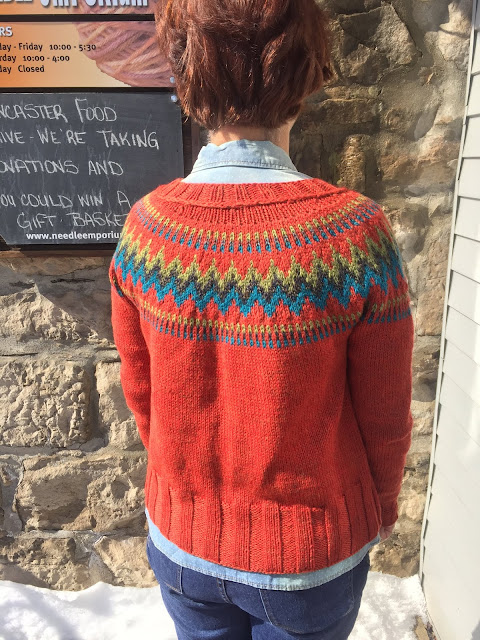 Doreen came in wearing her Throwback. She did an amazing job. She chose Cascade 220 for her cardigan. I love the colours!