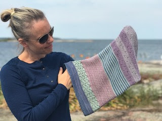 The pattern calls for 3 colours but you have 5 in the kit. You can see that there is a big section in the middle of rose. That is one skein. Cathy repeated that pattern for the whole skein. On the right side you see that there is striping of two mauves - that takes up both skeins. Then the other two colours (blue and green) are used for stripes and a lace pattern.