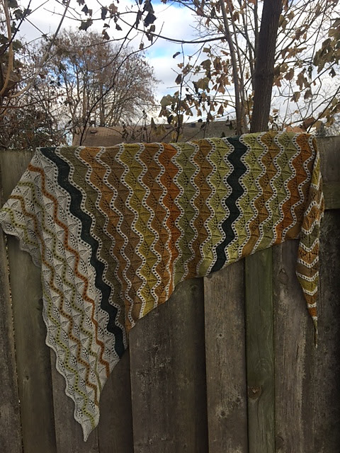 It knits up to a generous size, with a simple lace pattern creating a stunning scalloped effect. Eyelet stripes separate gradient color bands, which become the accent color when the scheme is reversed near the end.Because I was up late last night I'm super tired this afternoon. Survivor is on at 8 and I'll be in bed just after 9. I hope to sleep without thinking about yarn.