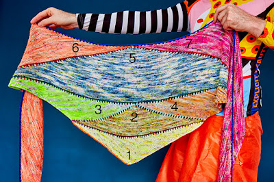 Gather a collection of fingering weight colors to knit this short row shawl design. Dive into your stash and use little bits of yarn and leftovers for the garter stitch sections and eyelet contrast stripes. There are seven sections for you to play with speckled or tonal yarns, perfect for featuring those souvenir skeins from your travels and yarn festivals. Contrast color eyelets decorate the garter stitch sections and I-cord edges frame the triangular shape.