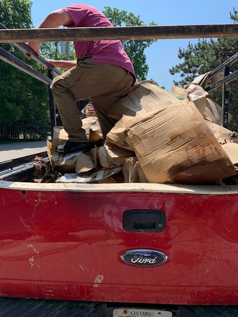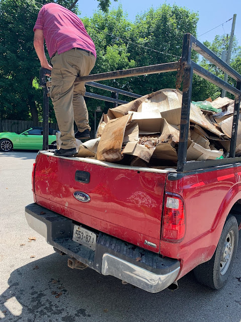 Dad came and cleaned up all our boxes today. After throwing them onto the back of the truck he gets up on them and stamps them down. Not something a 77 year old should be doing but there is no stopping him.