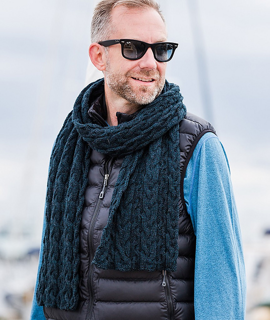 This nautical blessing describes that happy confluence of good fortune and the good sense to go with the flow. The simple braid pattern on the scarf has cable twists on alternating sides for complete reversibility. The cables on the cap converge neatly at the crest. Both promise smooth sailing!