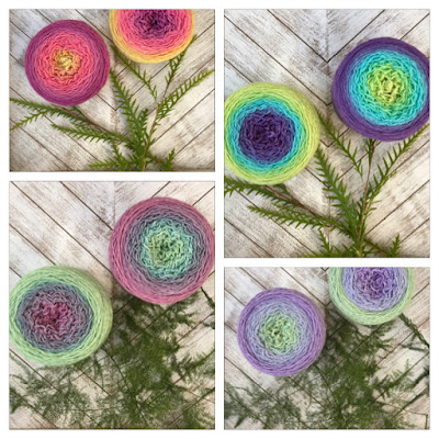 Inspired by our “Infinite Stripes” pattern, we wondered what would two color-morphing cakes of “Blossoms” do if worked together from opposing ends. So, we took two cakes of the same colorway and knit stripes--two rows from one end of one cake, and two rows from the opposite end/color of the other cake. The result was lovely! With a dramatically morphing cake--such as shown in “Zinnia”--even the center-most colors (which are very close to the same) are discernible. With a gradient cake--such as shown in “Globe Thistle” the shifts are very subtle and the center-most colors met and merged in the middle.