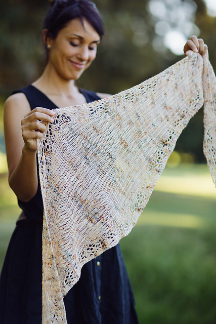 Venezia is a precious, delicate shawlette, perfect for any single skein of fingering weight yarn. Worked from tip to tip, with a reversible lace pattern and a diamond shape.