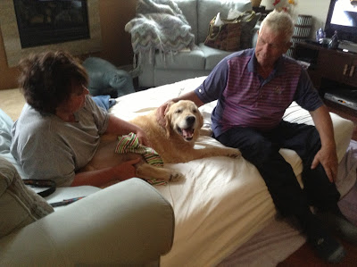 Mr. Roko is home. He is very sore and cries a lot. Cookies make things much better. The vet had to break his leg and insert a metal piece. I don't know all the details-I'm not the best with medical talk. Gets me queasy. This is Beth's bed for the next week because Roko is not allowed to do stairs. So much for the living room. They have already decided that they might live here for good. Beth has to do exercises with him 4 times a day and then ice the incision. For the next 8 weeks he has to walk on a short leash. Even if we take him in the back yard.