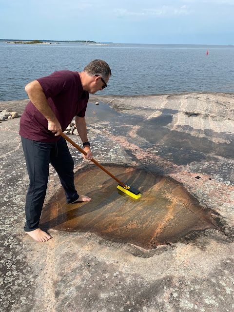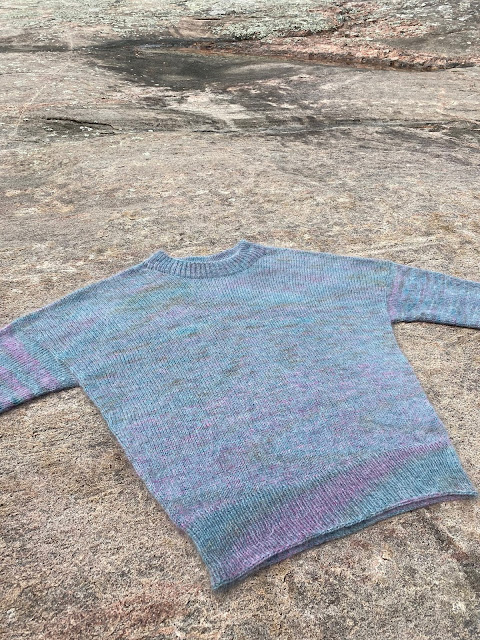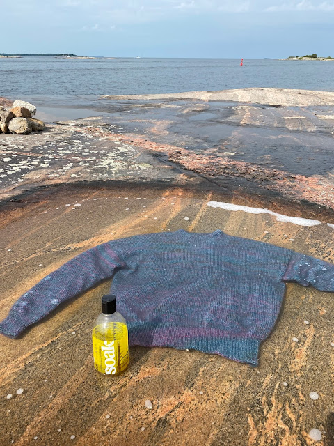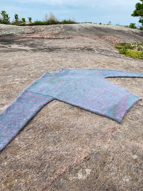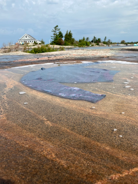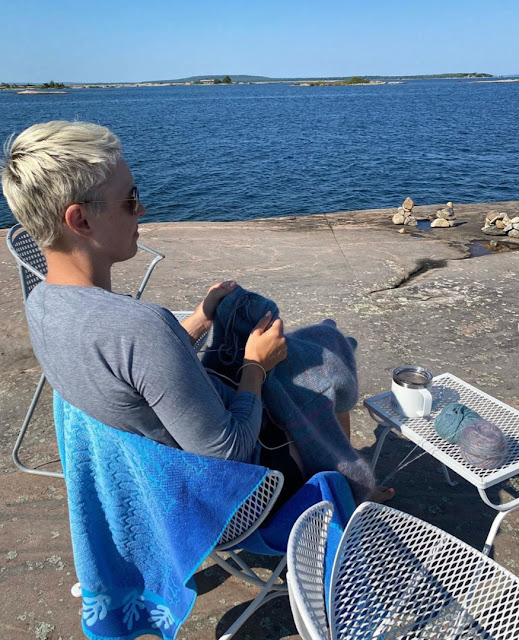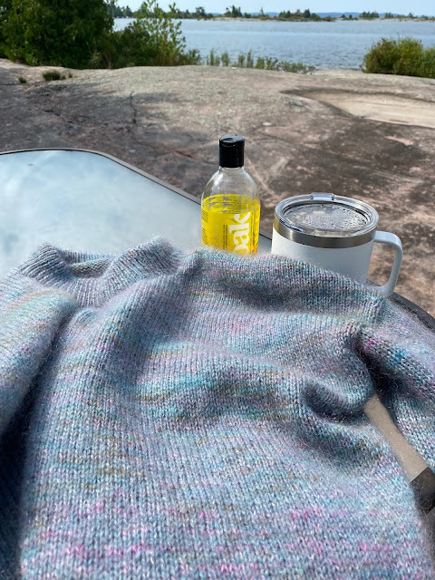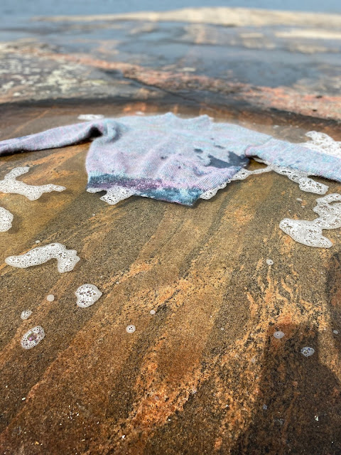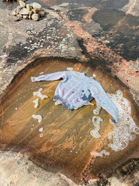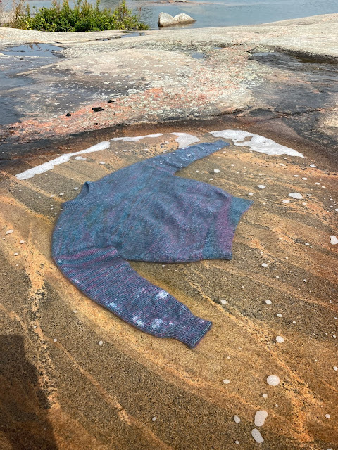 Sarah sent a text this morning that she finished a sweater while at the cottage. What a great way to block. This is her husband John cleaning up the rocks for her.