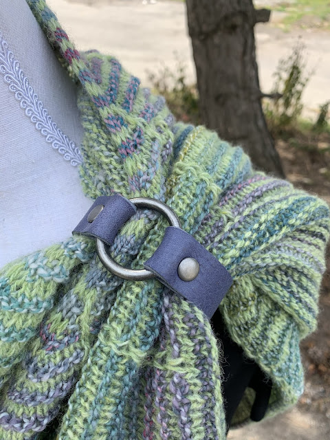 I went to the store to water the gardens so I took pictures while I was there. I tried it with different shawl cuffs. This is the Original Ring. Wildberry Leather. Brass Ring.