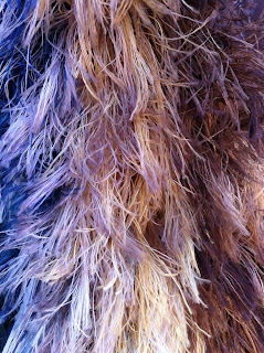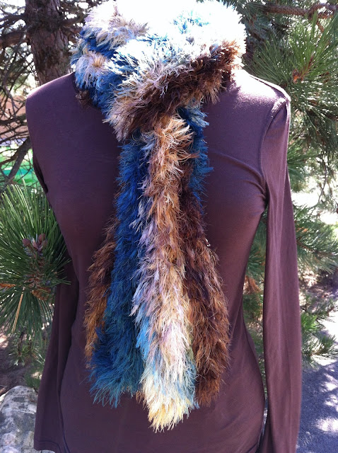 An incredibly soft, luxurious faux fur yarn, hand-dyed Plume is made even more wonderful through our special finishing process. We love it best used as an accent with a flatter yarn, where it has the appearance of real fur. Cuffs, collars, cowls, scarves: Plume will be your new best friend!I really needed mindless knitting this past week so I made this scarf.