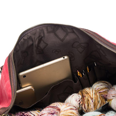 The bag features leather handles, an adjustable shoulder strap, a pattern holder, and a hidden project bag in the side pocket with a yarn feeder for easy knitting on the go with crafting specific features: