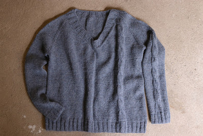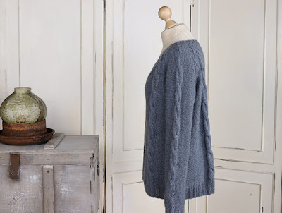 Crummock is a classic V-neck pullover with plush cables on the left of the body and sleeve. Designed by Neringa Ruke for Lore, it uses a clever centre-front seam to join the panels of stocking and reverse stocking stitch.