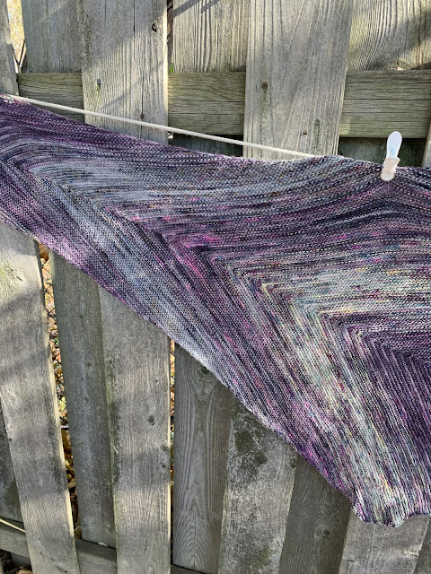 I knit this after making Find Your Fade so I faded my colours. My shawl is four skeins of fingering weight - the yarn I used is no longer available. My shawl is much bigger than the pattern because I knit all four skeins. You can easily make the shawl with three skeins.I made two combinations with Uschitita - Days Like This on the left and Eyes Wide Shut on the right. Tiny Dancer is in the middle in the picture above and Feather is in the picture below.