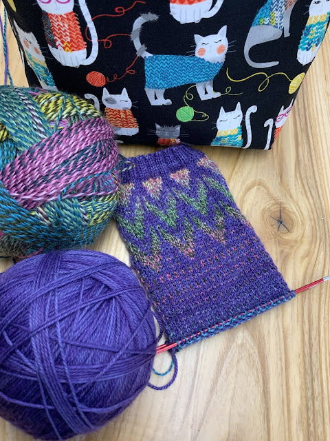 The pattern is called Wharfedale by Sarah Hatton and you can purchase it on Ravelry. Mary used Arranmore Light.Enjoy your winter walks in style with this beautiful cabled jumper. It’s a long, roll-neck design with dolman-style sleeve caps; the long sleeves are picked up and knitted downwards. The central panel features an elegant interpretation of the OXO cable pattern.Lynn brought her sock in today and she got a lot of knitting done. Unfortunately she has to restart her sock. Her contrast colour (the multi coloured ball of Crazy) is receding into the work. It doesn’t show up very well. When she got to this part of the sock she realized that she should have been carrying her colours differently. The purple should be carried across the top and the Crazy should be carried underneath. This will make the Crazy stand out better and is called Colour Dominance.
