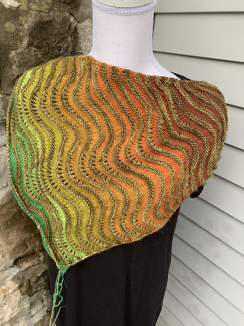 This fingering weight shawl is knit sideways starting at the little edge and increasing toward the wide edge. One main color is featured throughout all the garter stitch stripes. Eight contrast colors are used for painting the waves in stockinette stitch. The stitches are very easy to knit with I-cord edges framing the wavy triangular shape. This design is perfect for using mini skeins, leftover bits of fingering weight yarn, or self-striping yarns.This is the minikin kit that I am using. I should have taken a picture of the box rearranged for my colour order. My first ball was left column in the middle. My second ball is top row middle. My third will be the very middle ball knit from the middle - turquoise to turquoise. I have it worked out so that my colours should blend from one ball to the next.The pattern is well written and easy to follow. Once you get going it’s pretty mindless.