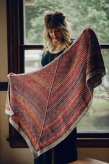 Garter and brioche will always be my go-to ingredients for creating my favorite shawls to knit and wear! This shawl plays with two-color Garter and Brioche with the increases offset to create an asymmetrical shawl that wants to be wrapped right around you! This shawl turns up the volume on texture by using DK weight yarn in one color and Sport weight yarn in the other color!