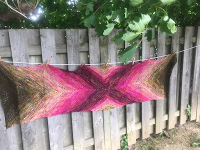 From June 13, 2018 - My Fading Point. I knit this with 5 colours of HH Sock. Fading Point is constructed from both ends towards the centre, and then both pieces are connected with triangles to achieve a seamless rectangle.