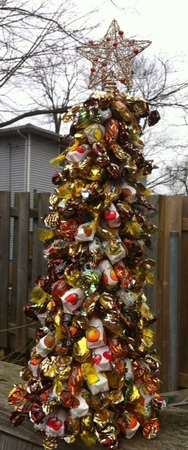 Today I received this beautiful candy tree from a customer. The inside is styrofoam and she pinned every piece of candy on it. What a lot of work. It looks fabulous!! She said that the star came from the dollar store so if you need a last minute gift you still have time to make a few of these.