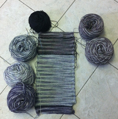 All the Shades of the Truth. I'm using the Fifty Shades of Grey colours of Lorna's Laces Shepherd Sock. There are five skeins and each skein has ten shades of grey. The last shade is the solid grey for the borders. I'm calling it Fifty One Shades of Truth.