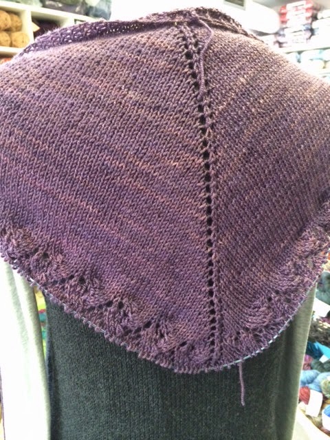 I finished the first lace panel of Ishbel last night. A sneak peek of one of the super secret yarns in colour. This is midnight aubergine.