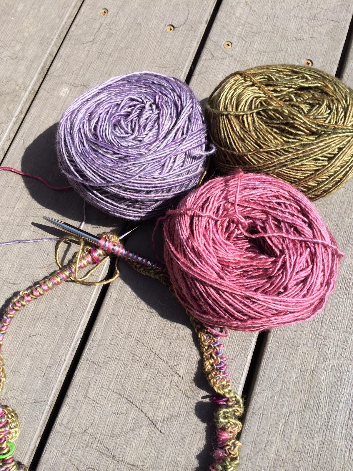 Beth was going by the storage locker yesterday and I asked her to pick me up a couple of skeins of the merino/silk, dk weight yarn. We couldn't decide if the purple (wild huckleberry) and green (boston fern) had enough contrast so I asked her to bring vintage port as well.
