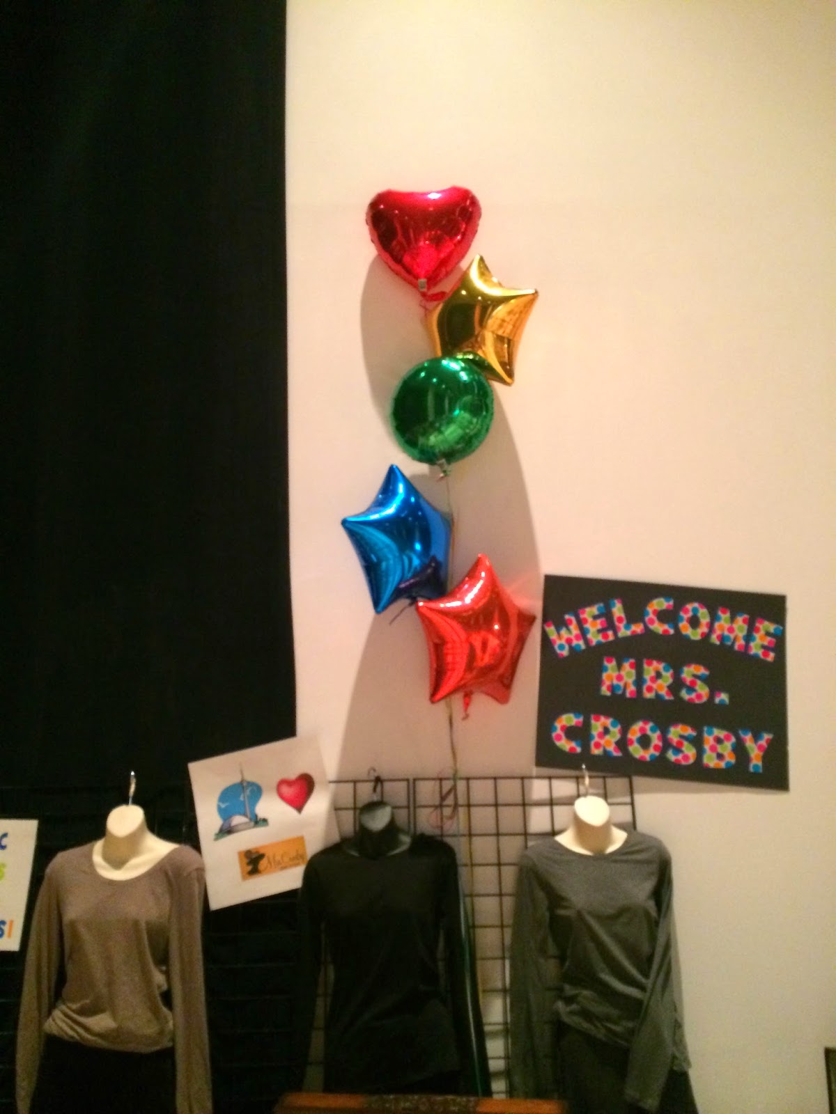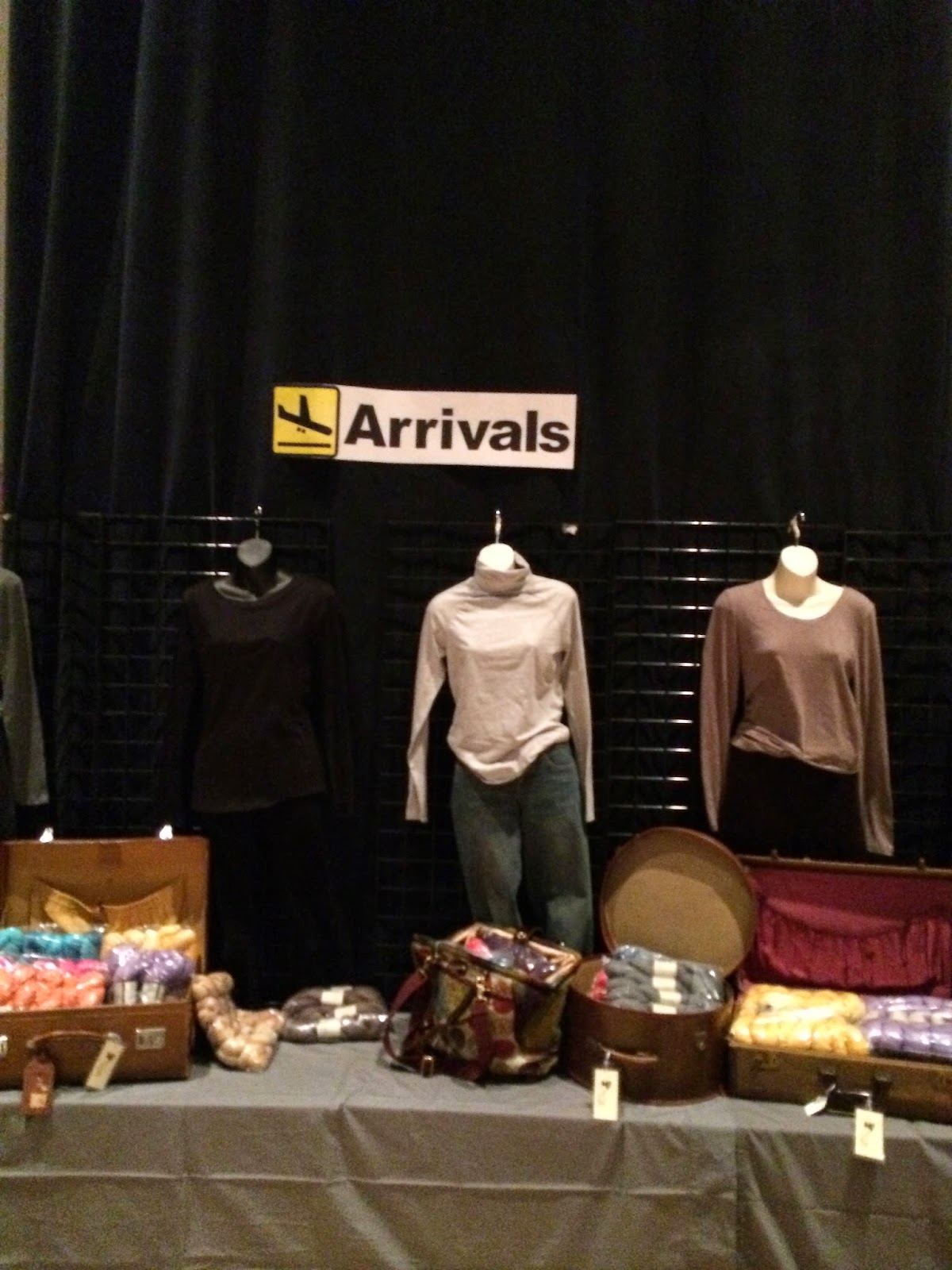 Things get moved around too. The arrivals sign will appear in a different spot in another picture.Tomorrow morning we need to finish taking the yarn out of bags, put up garments and price signs.