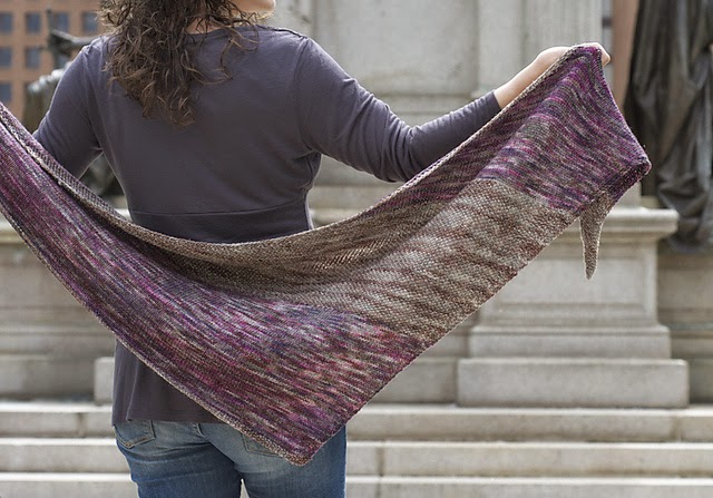 Worked sideways, this asymmetrical-triangle shawl is shaped with short rows. It features seed stitch sections in a contrasting color.