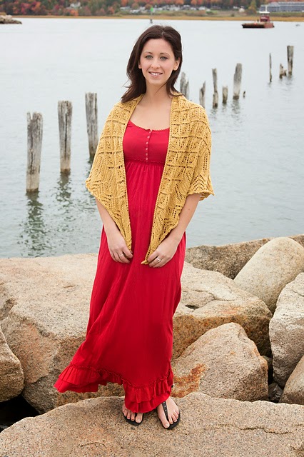 We've been rearranging garments and found our Kalinda shawl knit in Classic Elite Cerro. The pattern is available in a book (#1402 Sunny Day) or you can buy the individual pattern on Ravelry.