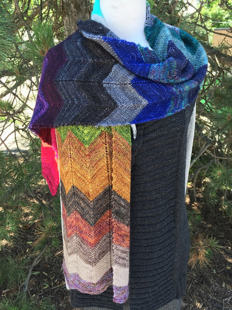 Inspired by a line of poetry from William Butler Yeats, this modern honeycomb lace stole is distinguished by rays of stockinette bursting from one corner.And it is perfect timing because a box just arrived from Lynda. Unicorn Stripes (pattern purchased on Ravelry) is done.