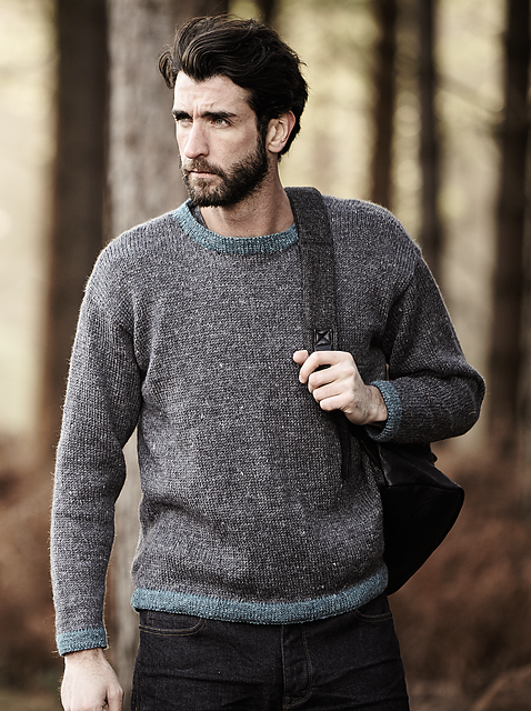 Knitted in Rowan Hemp Tweed, this classic seamed pullover has a fresh look with a contrasting colorway in the ribbing of its neckline, cuffs, and hem. The dropped shoulder sleeves have set in shaping to lessen bulk at the underarms, and thus a more tailored fit.